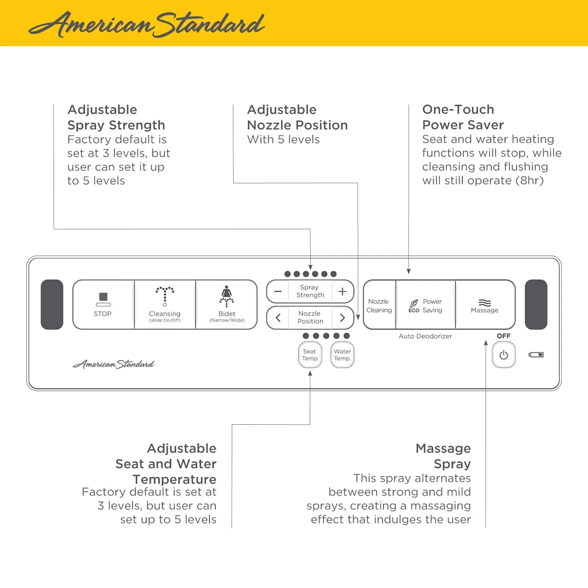 - Electric bidet feature with multiple customizable settings for the heated seat and adjustable spray nozzles