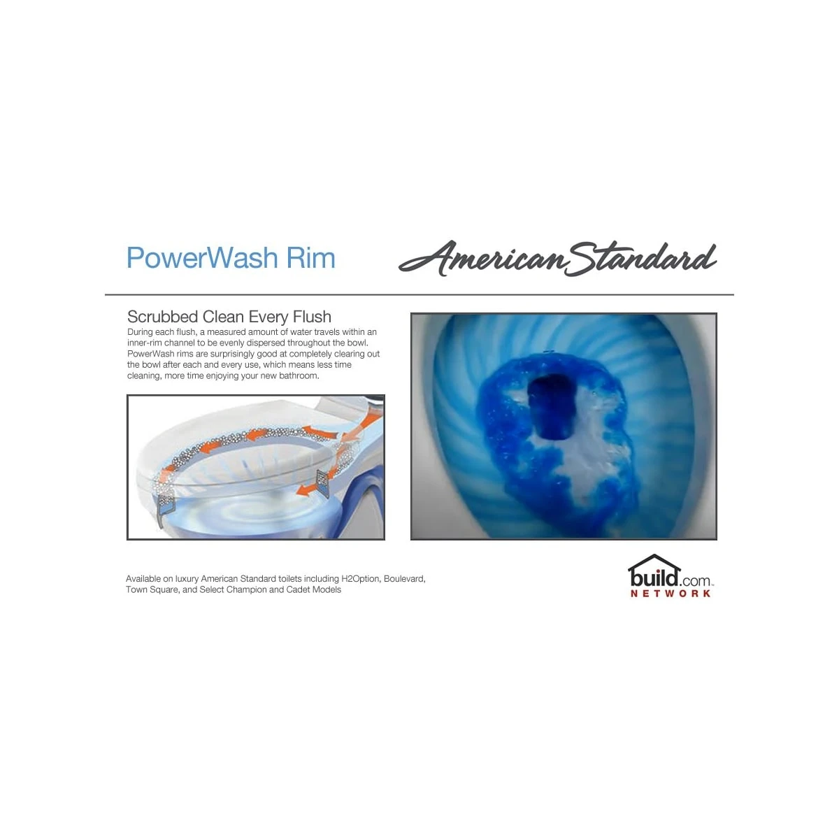 - PowerWash Rim – During each flush, a measured amount of water travels within an inner-rim channel to be evenly dispersed throughout the bowl. PowerWash rims are surprisingly good at completely clearing out the bowl after each use.