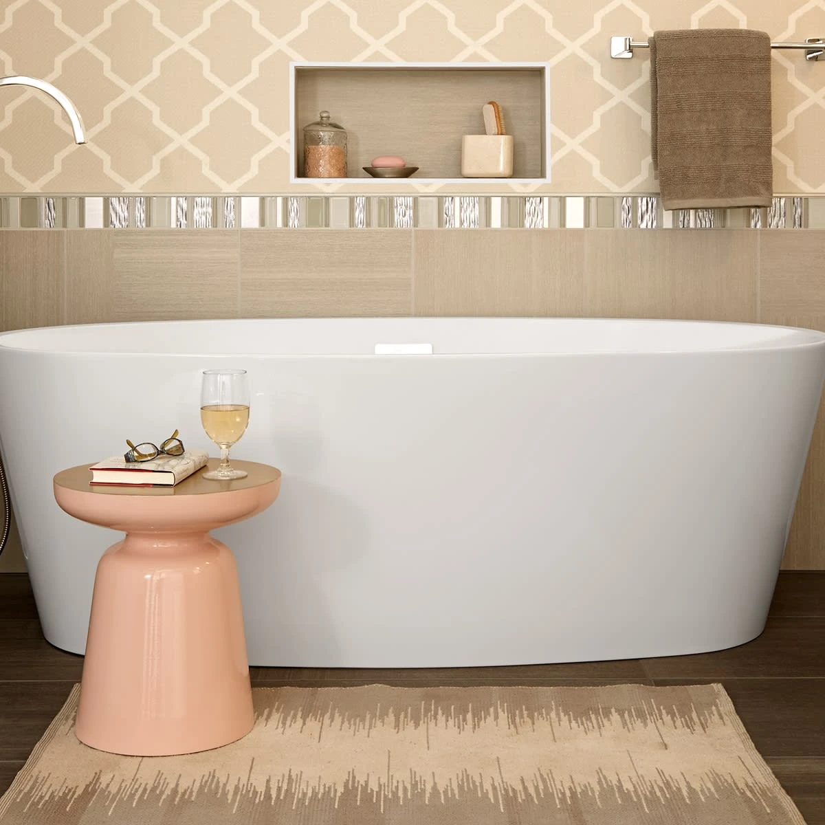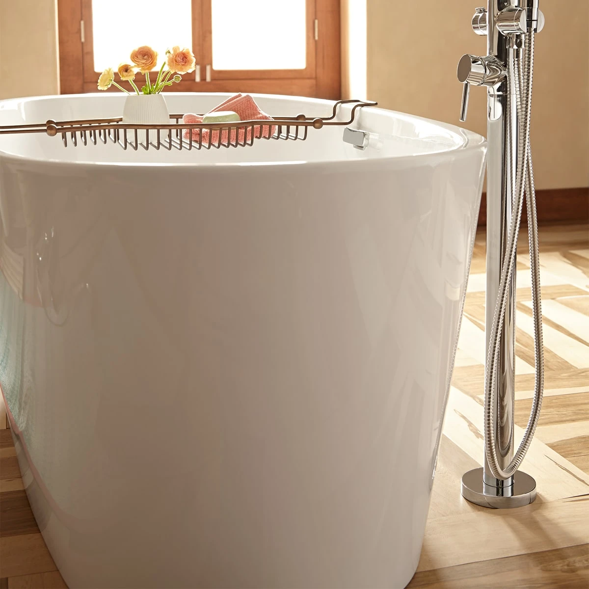 - Soothing soaking tub with a roomy interior and deep bathing well