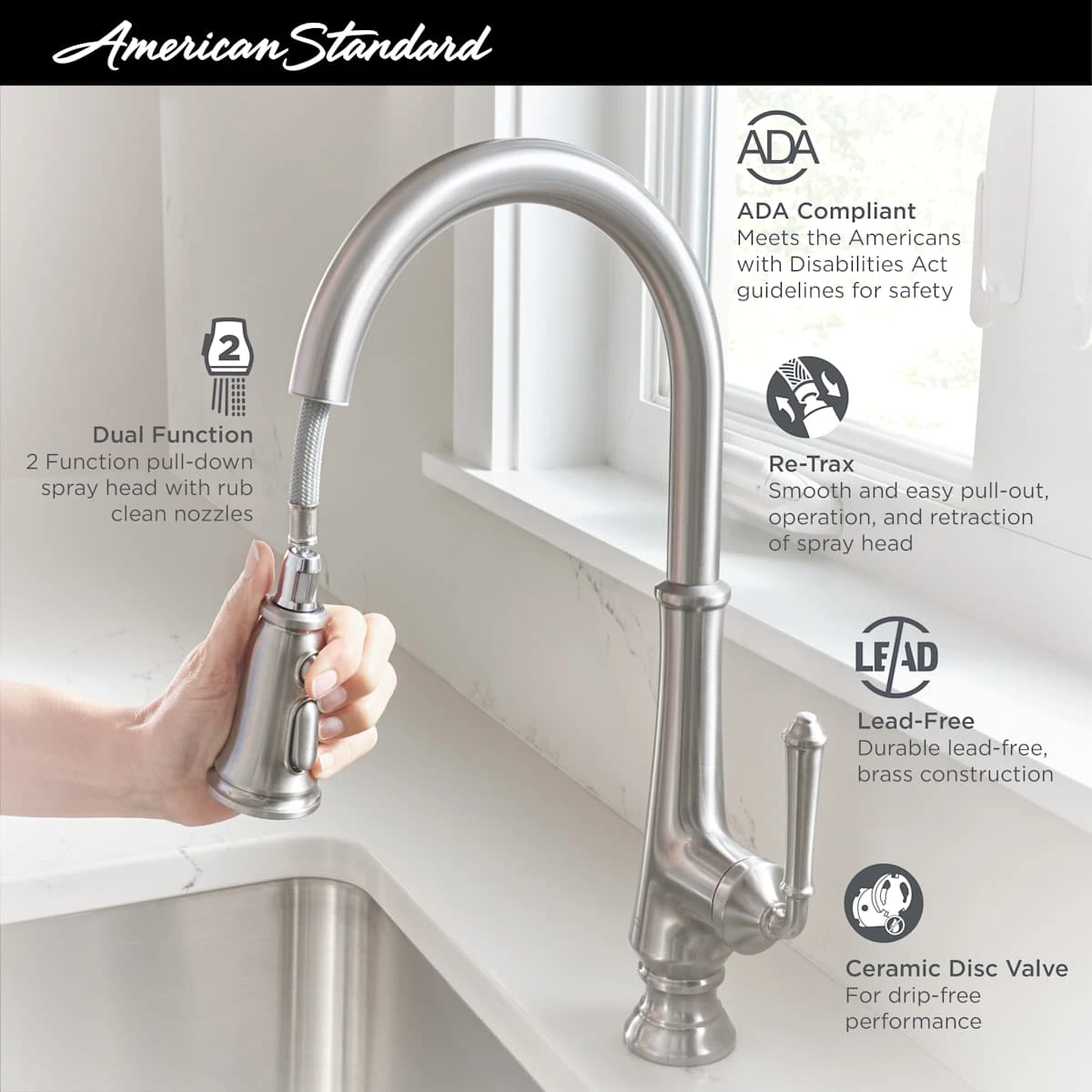 - Swivel spout allows for greater access to all areas of the sink
