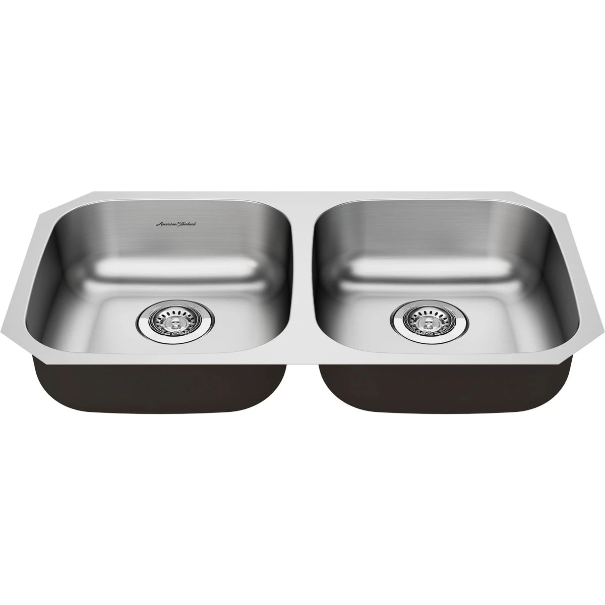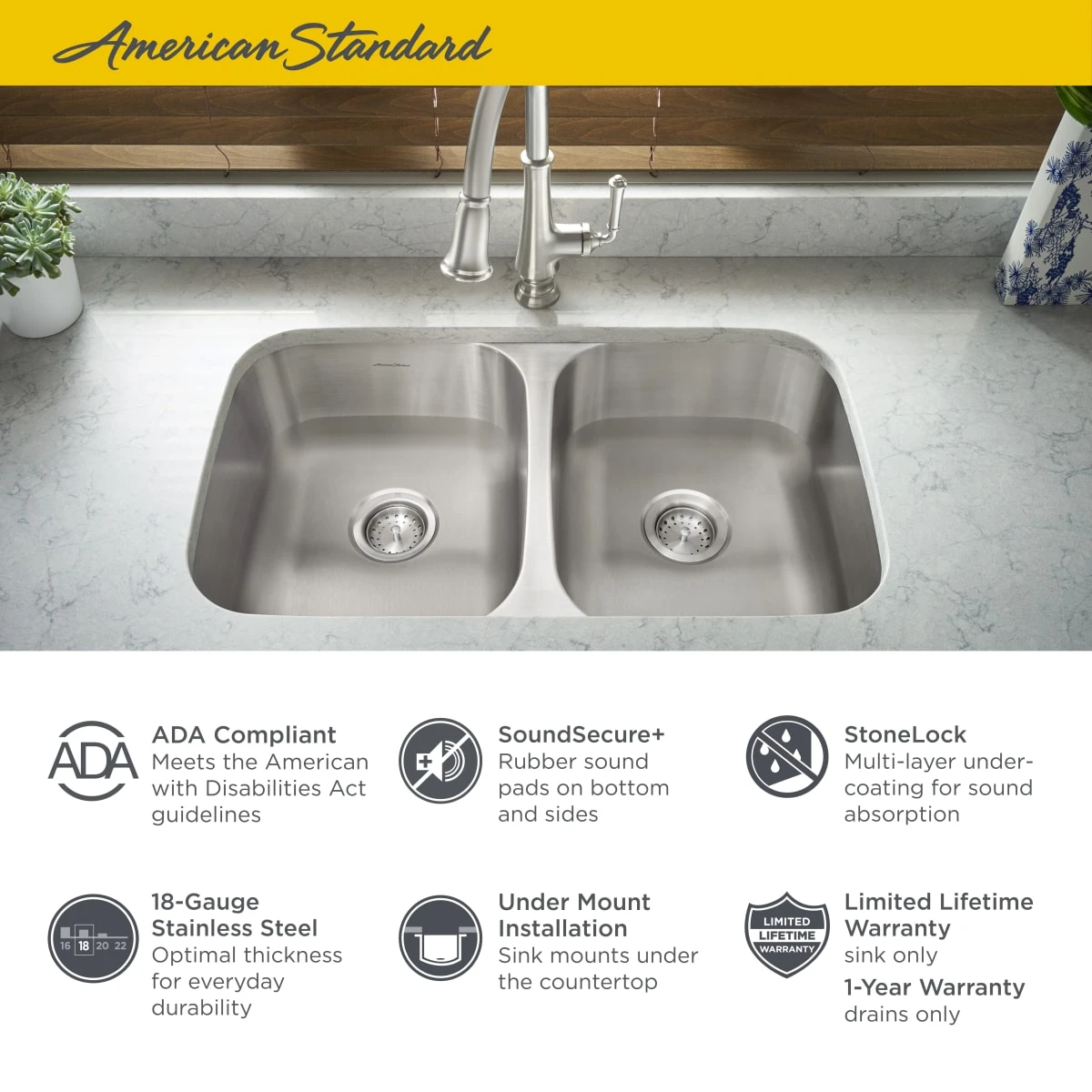 A perfect blend of classic style and modern functionality, the Portsmouth double bowl undermount stainless steel kitchen sink from American Standard coordinates seamlessly with every kitchen. This ADA compliant sink is 6” deep for easy accessibility and featuresbottom and side sound pads for reduced noise and vibration. Multi layer spray insulation ensures optimal protection against scratches, heat, and condensation. Made of durable 18-gauge stainless steel, it pairs perfectly with the Portsmouth Kitchen Faucets.