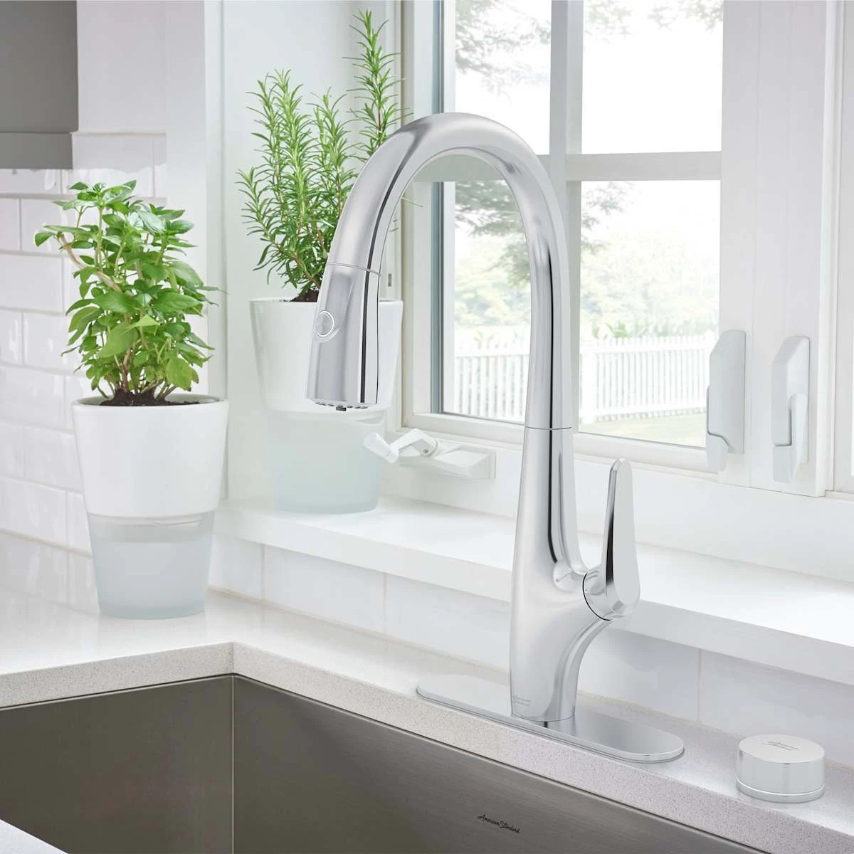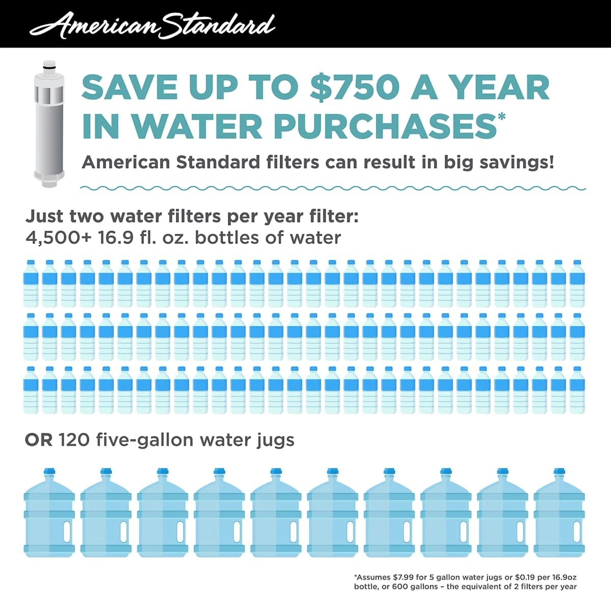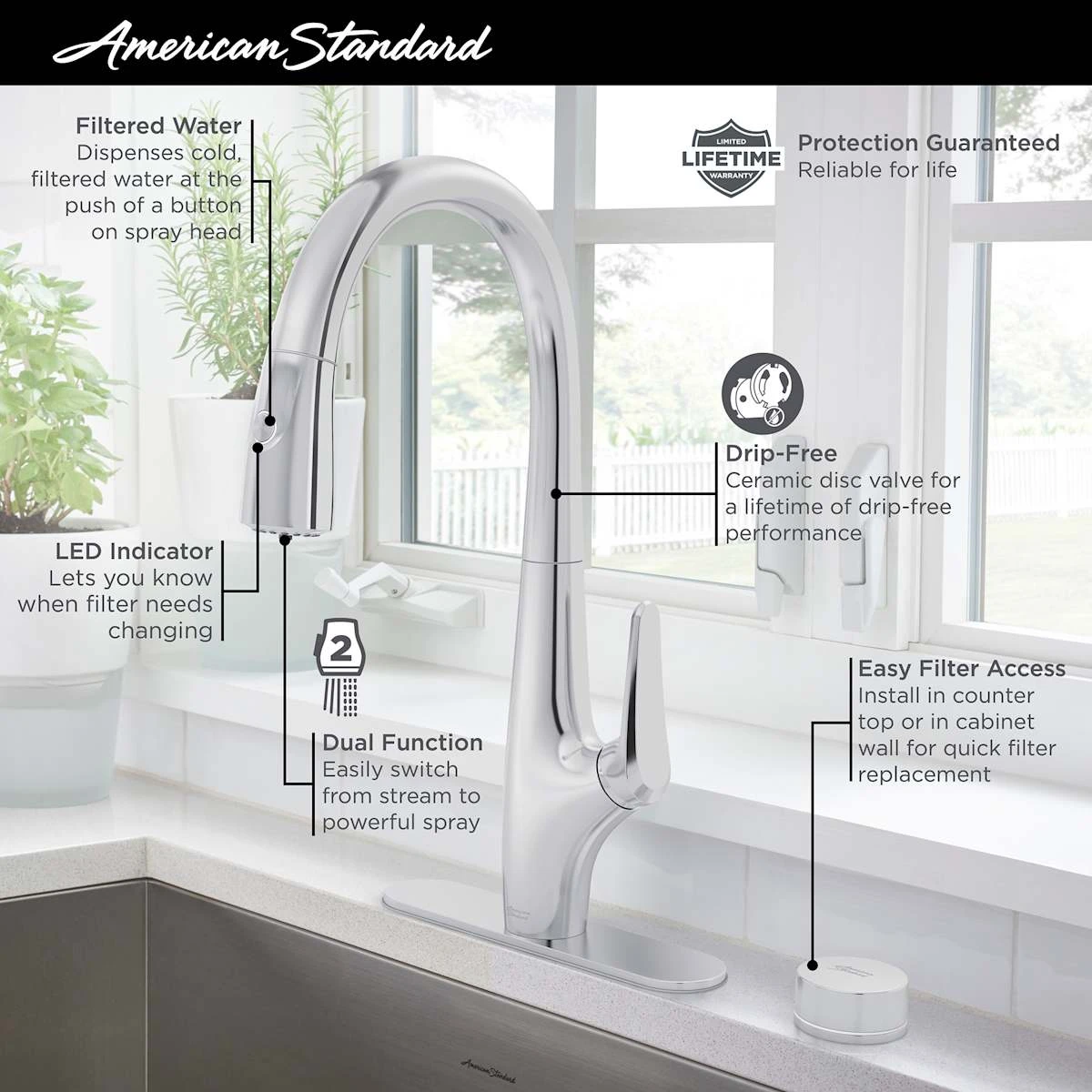 Enjoy the confidence of knowing your tap water is clean and safe to drink with the Saybrook Filtered Kitchen Faucet from American Standard. As a leader in providing solutions for better living and increased well-being, this American Standard kitchen faucet reduces 99.7% of lead, 96.9% of chlorine, and 92.6% of class I particulates* from your tap water at the push of a button. The Saybrook Faucet dispenses both filtered cold water and ordinary tap water through two separate water channels removing any chance of mixed water flow. For drinking and cooking, simply push the button on the spray head for filtered water. For ordinary tap water, use the lever handle. Environmentally friendly, the Saybrook Faucet puts filtered water at your fingertips, eliminating reliance on plastic water bottles, heavy 5-gallon jugs, and bulky external filters. Thanks to an LED indicator light, you’ll know when the filter needs to be replaced, ensuring your water is always clean and fresh-tasting. This innovative design allows for quick, above-the-deck filter replacement; no more reaching under the sink. Or, if deck space is limited, the filter can be installed on the inside wall of the cabinet. *Based on NSF / ANSI 42 and 53 standards @ 6.5pH