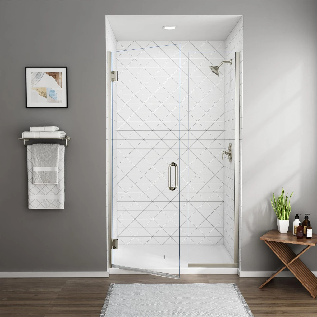 Elevate the look of your bathroom with the frameless swing shower door with Panel from American Standard. Clear 3/8” thick tempered safety glass creates an airy, open ambiance and features a protective coating that helps to repel water and spotting for a longer lasting shine and easy cleaning. Simple yet sophisticated, this frameless look is supported by sturdy metal hinges designed to last a lifetime.