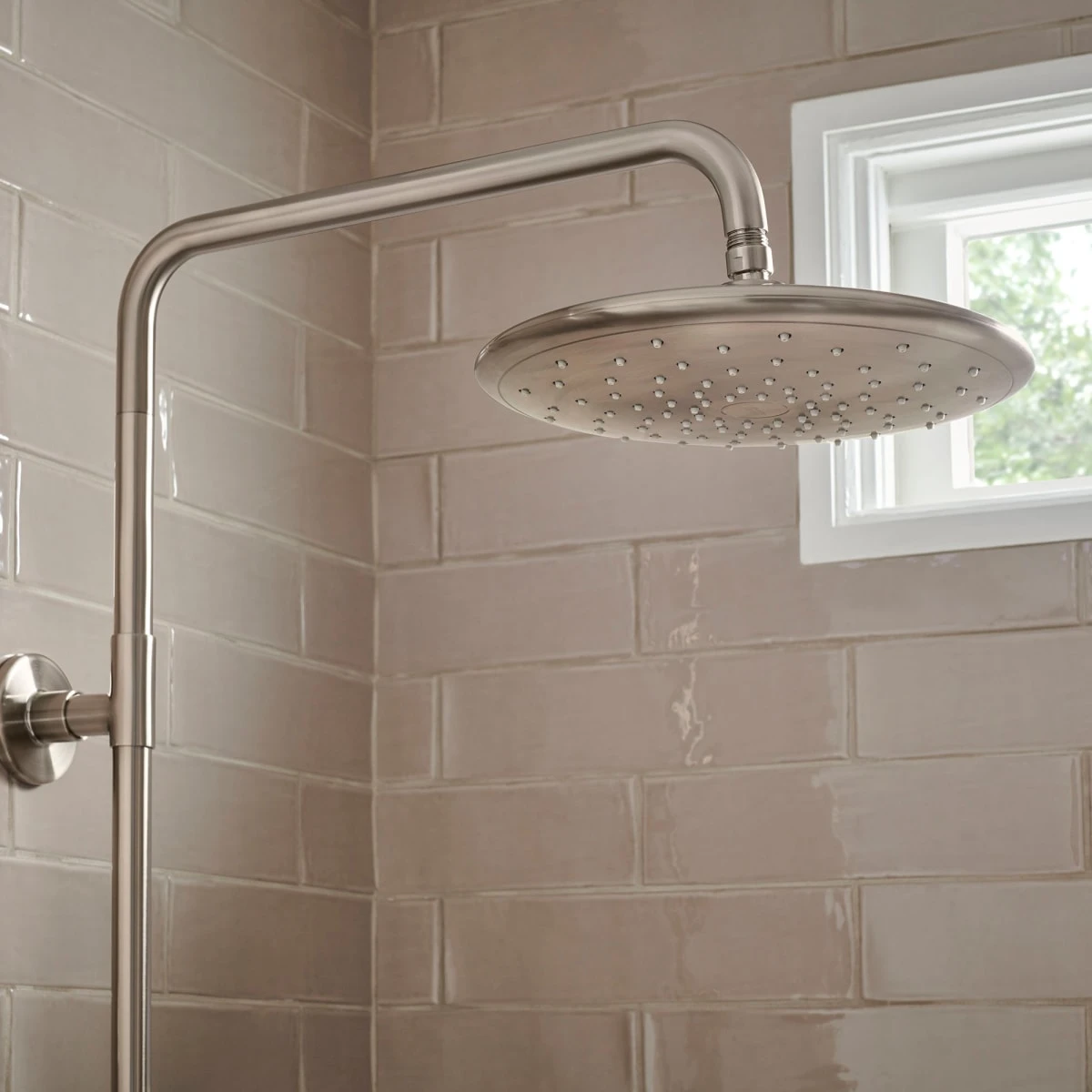- Raises Rain showerhead 5” to fully experience a drenching sensation