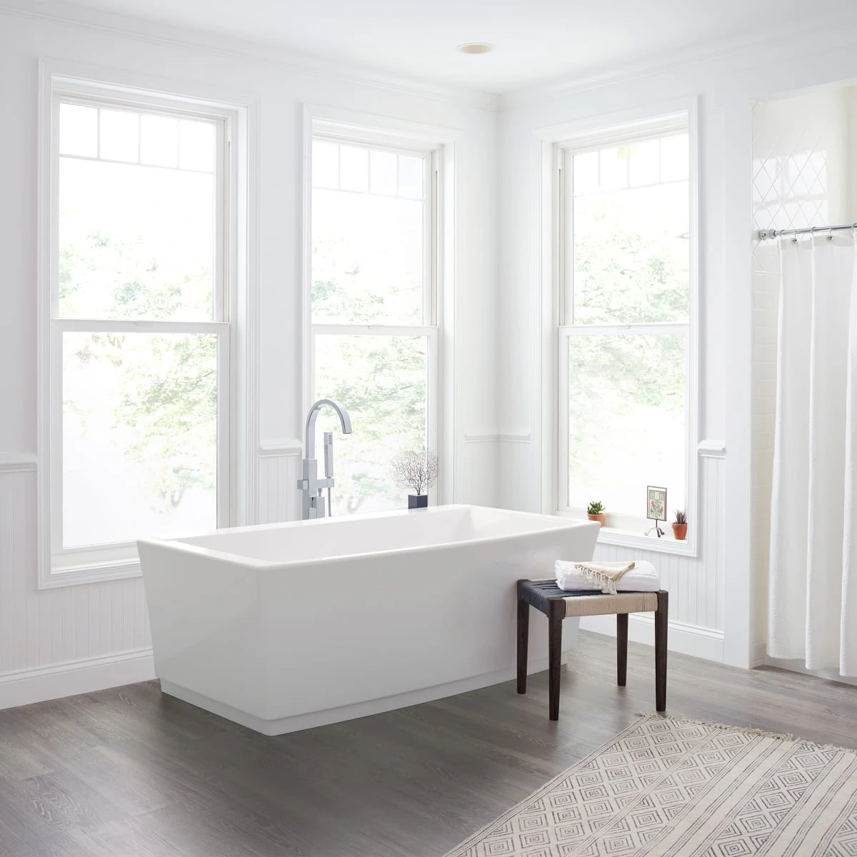 The Townsend 68 in. Acrylic Freestanding Soaking Bathtub from American Standard features a luxuriously deep bathing well for total immersion and complete relaxation. Versatile design features a flat back for flush-to-the-wall installation that saves space without sacrificing the elegance of the Town Square S profile or install away from the wall for a true freestanding look. Accommodates a Roman, wall-mount or freestanding tub filler.