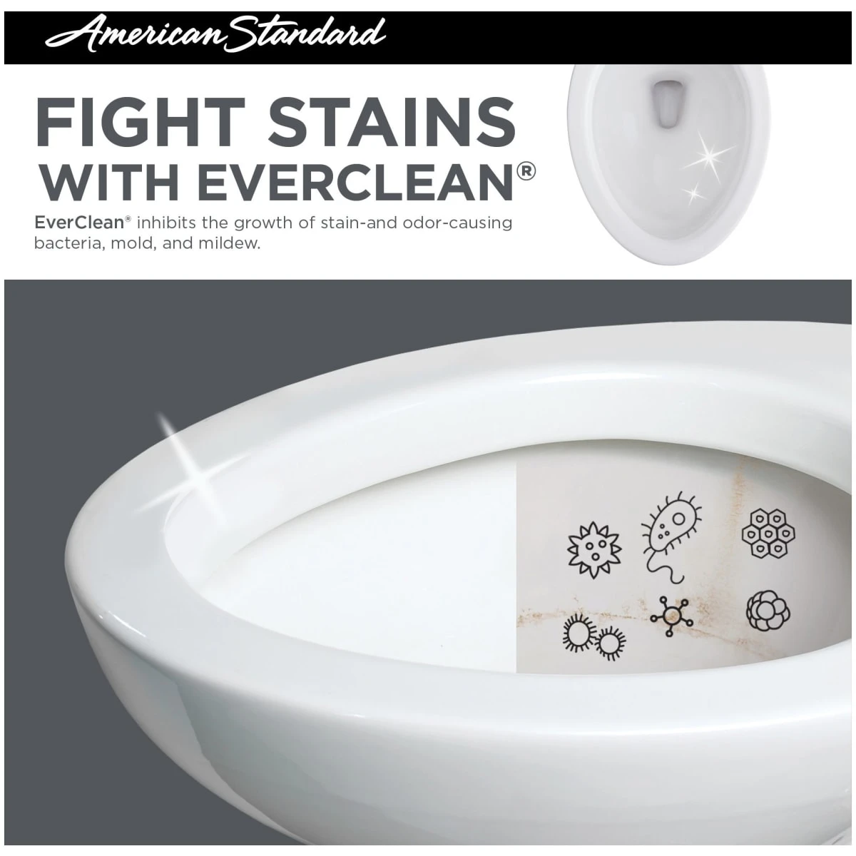 EverClean™ Surface: Using the antimicrobial properties of silver (the precious metal), EverClean Surfaces inhibit the growth of bacteria, mold, and mildew. The super smooth, baked-in, mirror-like surface not only eliminates unsightly rings, but also helps repel toilet messes.